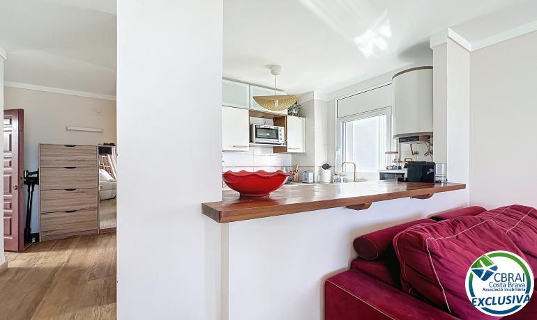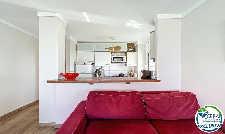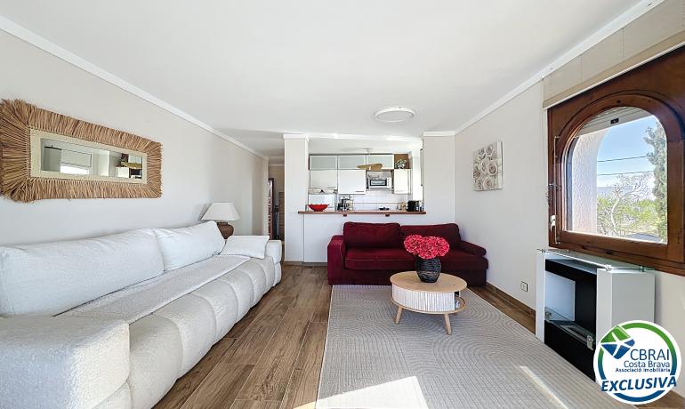 In the sought-after area of Puig Rom, this renovated 57 m² apartment located on the 1st floor of a residence with communal pool and parking stands out for its spectacular views over the entire Bay of Roses and partly over the natural park.